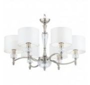 Материал основания – металл, цвет – никель. Абажуры из белой ткани на ПВХ. Декор центральной части и рожков – прозрачное литое стекло с рельефной фактурой. Высота люстр регулируется длиной цепи.