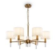 Металлическая арматура. Цвет – латунь. Тканевые абажуры белого оттенка. Декор – прозрачные акриловые трубки. Трендовая комбинация фактур и материалов. Широкий ассортимент. Торшер и подвес с цоколем Е27, лампа, бра и люстры – Е14.