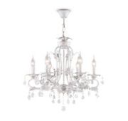 Металлическая арматура в двух вариантах цвета — хром или золото. Прозрачные декоративные элементы из хрустального стекла. Широкое кольцо снабжено LED-источником света. Цветовая температура потока излучения — 3000 К, угол рассеивания — 120 градусов. Регулируемый по высоте провод длиной 3 метра. Украшение шахматным рисунком.